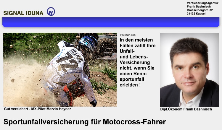 Hallo liebe Moto Cross Fahrer, wir versichern seit einigen Jahren Marvin Heyner und andere Moto Cross Fahrer des EC Hofgeismar und anderer Vereine und haben durchweg positive Erfahrungen gesammelt. Wir möchten Ihnen ebenfalls die Möglichkeit anbieten diesen Versicherungsschutz gezielt auf Ihre Bedürfnisse abzustimmen. Es handelt sich hierbei um ein spezielles Produkt für Moto Cross - und Rennsportfahrer, inklusive Gipsgeld: Nach einem Knochenbruch sowie nach einem Muskel-, Sehnen-, Bänder- oder Kapselriss erhalten Sie ein Gipsgeld in Höhe der vereinbarten Versicherungssumme. Natürlich sind auch andere Leistungen versicherbar: Invaliditätsleistung, Unfallrente, Reha - Leistungen usw. Bitte beachten Sie, dass die meisten Unfallversicherungen (und auch Lebensversicherungen) das Rennsportrisiko nicht abdecken, da die Versicherer, in der Regel eine Ausschlussklausel für den Teil Erzielung von Höchstgeschwindigkeit vorgesehen haben. Mit anderen Worten: In den meisten Fällen zahlt Ihre vorhandene Unfall- und Lebensversicherung nicht, wenn Sie einen Rennsportunfall erleiden!!! Für Rückfragen und die Unterbreitung eines individuellen Angebotes stehe ich Ihnen jederzeit zur Verfügung. Frank Baehnisch |