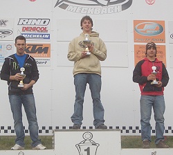 | Beim Start zum 2. Lauf bin ich besser durchgekommen und war schon zu Beginn so auf Platz 6 oder 7. Nach einem Table crashten Adrian und Selent und ich konnte bis auf den 4. Platz vorrücken. Es setzte heftiger Regen ein und die Streckenbedingungen veränderten sich von Runde zu Runde. Ich habe dann Tim Münchhofen überholt und lag auf dem 3. Platz. Wie bei den meisten Fahrern verabschiedete sich irgend wann mein Roll Off und an ein überholen war nicht mehr zu denken. Ich fuhr dann meinen dritten Platz ins Ziel, mein bisher bestes Interergenis. Zu meiner großen Freude war ich dann auch noch Gesamtdritter und stand zusammen mit den alten DAMCV-Legenden De Jong und Münchhofen auf dem Teppchen. |